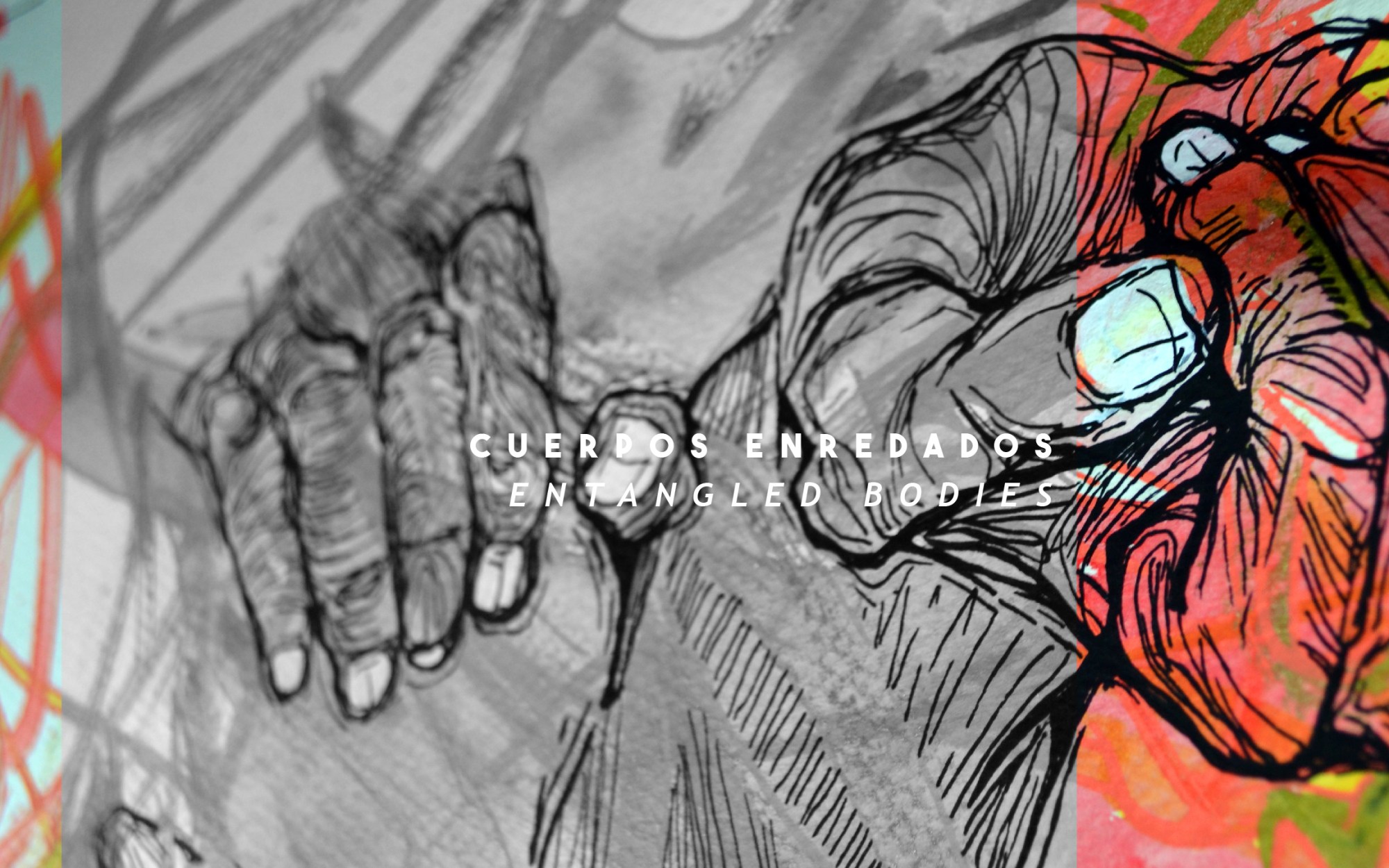 Cuerpos enredados es una serie de dibujos en donde predomina la anatomía humana acompañada por sensaciones y emociones que abrazan a los cuerpos con líneas y manchas.